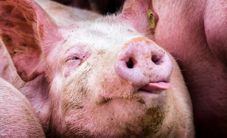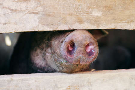 Dirty pig with muddy snout in organic farm pigsty, close-up on pig's nose.