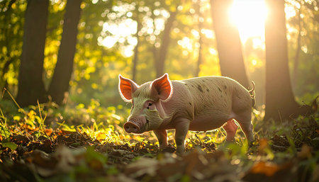 A young piglet enjoys the early morning light, foraging among the fallen leaves of an autumn forest. The warm sunrise filters through the trees, creating a peaceful and idyllic scene of nature and free-range farming.