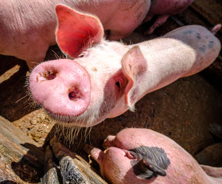Portrait of a domestic pig on a farm in the village.