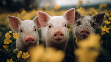 cute farm animals in the wild, three little pigs posing among yellow blooms, gentle depth of field, detailed natural textures, soft focus background