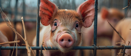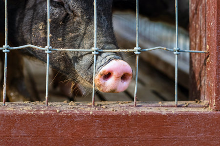 A little pig shows his round pink nose a little piglet with two holes sticking it out of the cage stall