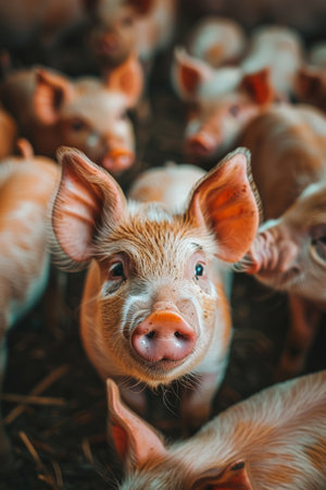 Curious Piglet Surrounded by Peers on a Cozy Farmstead.