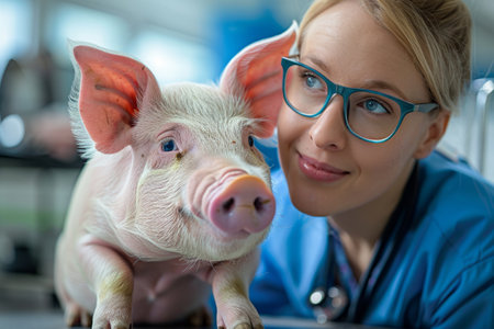 veterinarian examines a piglet pig in a veterinary clinic