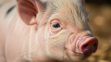 This close-up showcases a piglet's face, highlighting its pink skin and detailed features. The image presents soft textures, possibly in an outdoor environment. The composition focuses on the animal's eye, capturing its expression. Suitable for various applications, including editorial content and design projects.