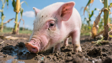 Little pig on the farm. Piglet in the mud. Pig on a farm.