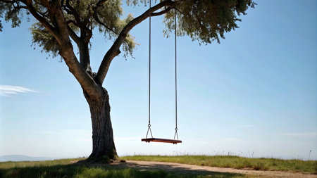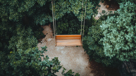 Cozy oak swing suspended from a sturdy branch, seen from above, capturing a moment of tranquility and simple outdoor joy.