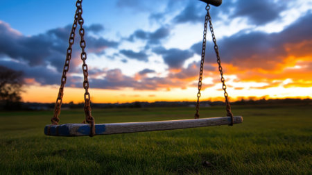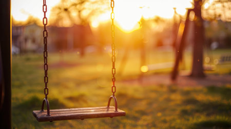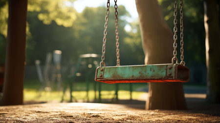 An empty swing hangs silently in a quiet park, its chains still. The scene evokes a sense of nostalgia and forgotten childhood memories, a poignant reminder of playtime and the passage of time.