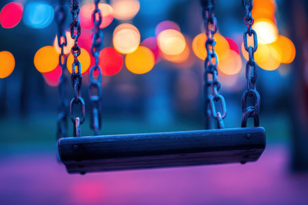 A swing hangs still in a playground at dusk, surrounded by glowing bokeh lights that create a playful and dreamy ambiance, inviting nostalgia and joy.