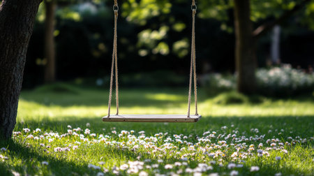 Empty Wooden Swing Hanging from a Tree in a Park, Surrounded by Lush Green Grass and White Flowers