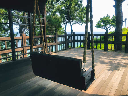 Wooden swings in a garden. Back view. Jeju island