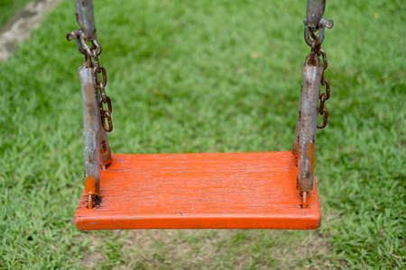 Orange wood swing chair hang by rope in the playground