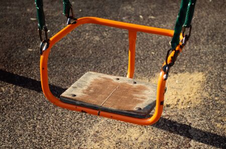 An empty old orange swing on a Playground on a summer evening.
