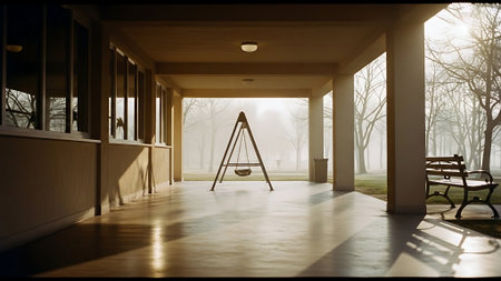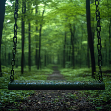 An empty swing hangs silently in a quiet park, its chains still. The scene evokes a sense of nostalgia and forgotten childhood memories, a poignant reminder of playtime and the passage of time.