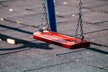 Details of playground in city park, view on seat of swing.