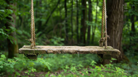 A rustic wooden swing hangs from a sturdy rope in a lush green forest, inviting relaxation and play. The tranquil setting emphasizes nature's beauty and peace.