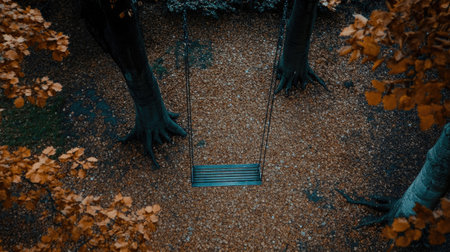 This aerial view captures a solitary swing in a serene park, surrounded by vibrant autumn leaves. A peaceful scene evoking nostalgia and tranquility.