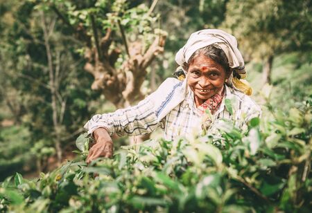 Ella, Sri Lanka - December 30, 2017: Old age female tea-picker picks up the fresh tea leaves in Ella town, Uva Province, Sri Lanka
