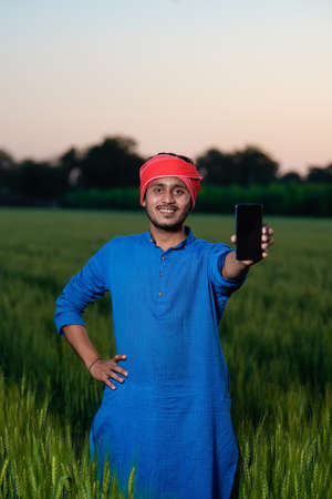Young indian agronomist or banker showing smart phone with farmer at cotton field