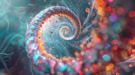 An abstract composition features a swirling spiral composed of countless colored particles. The artwork displays a variety of colors, creating a vibrant and dynamic visual experience. The design suggests a sense of depth and movement, potentially suitable for digital art, visual effects, and graphic design applications. The image can be used for a wide range of creative and commercial projects.