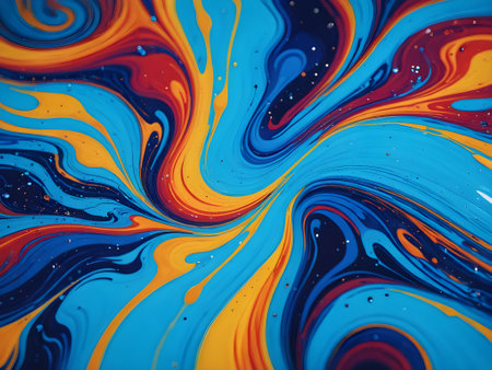 A psychedelic swirling marbling pattern in shades of blue, orange, and teal, featuring organic shapes and intricate fluid textures.