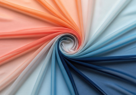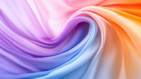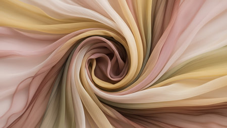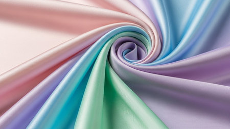 A close-up swirl of pastel colored silk fabric creating a smooth, flowing spiral pattern