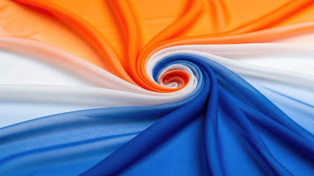 A colorful piece of fabric with a blue, orange, and pink stripe. The colors are vibrant and the fabric appears to be flowing