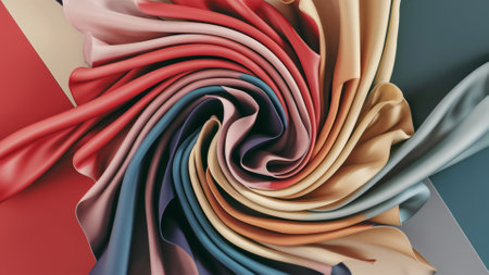 A swirling arrangement of colorful fabric creates a dynamic and vibrant pattern. The rich hues blend seamlessly, forming an eye-catching display. The fabric appears soft and fluid.