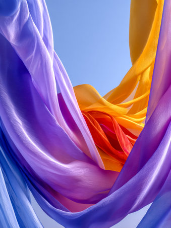 Vibrant silk scarves flutter gracefully, creating a lively mosaic of hues against a pristine sky, evoking movement, elegance, and joyful freedom.