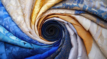 A collection of luxurious fabric swatches in rich indigo, cobalt, beige, and gold, arranged in a spiral on a neutral surface, ideal for elegant design ideas.