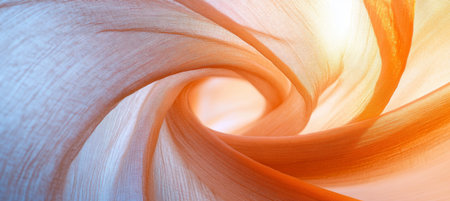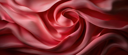 A striking macro view of a coral pink fabric gracefully swirling into a tight spiral. The delicate folds and soft texture create an elegant and fluid impression, highlighting the material's beauty and movement.