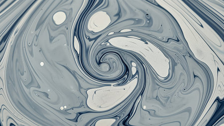 A captivating macro view of grey, blue, and white liquids mixing into a hypnotic spiral. The fluid motion creates elegant swirls and marbled patterns with a unique stippled texture.
