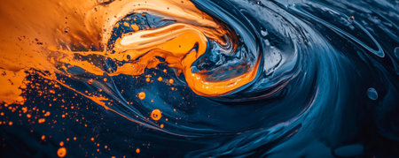 A dark blue and orange oil splash swirling together, with droplets adding dynamic energy to the composition.