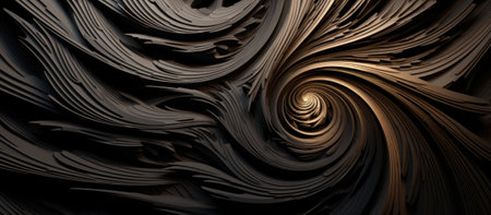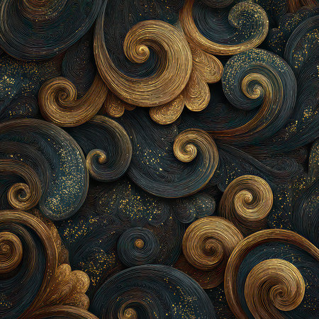 Spirals showing intricate golden spiral patterns with black filigree details on a textured dark grey background creating an ornate and abstract keywords: abstract, golden, spirals, ornate,...