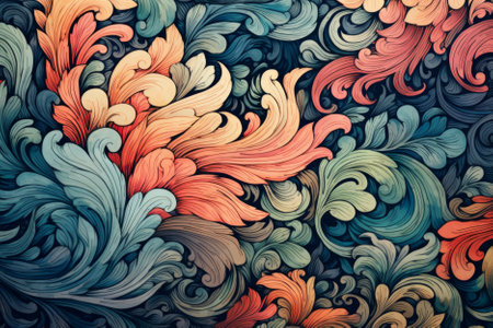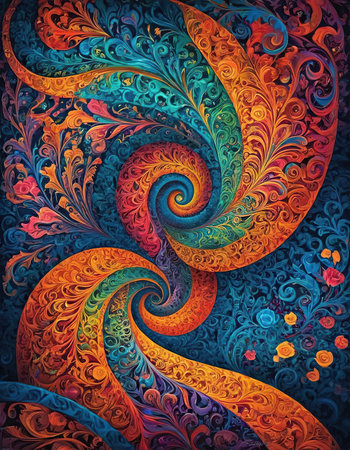Illustration of a colorful, bohemian inspired paisley pattern, with intricate swirls and vibrant hues of purple, orange, and turquoise. The rich colors and detailed shapes create an energetic, artistic vibe.