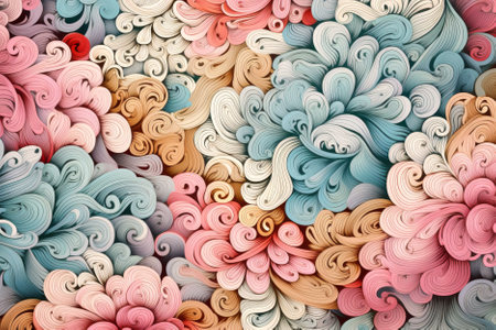 A detailed paper quilling pattern with swirling curves and pastel colors, creating an artistic background for text or images. The design features intricate designs that form patterns of light purple, pink, orange, yellow, white, and other soft hues on the surface, giving it a whimsical feel suitable as decorative artwork or digital backgrounds. --ar 3:2 --stylize 750 --v 6.1 Job ID: 6d4f976e-995b-4dd3-b3a8-524ee31dd008