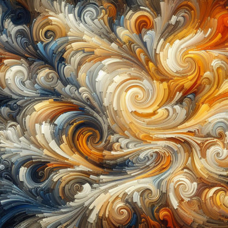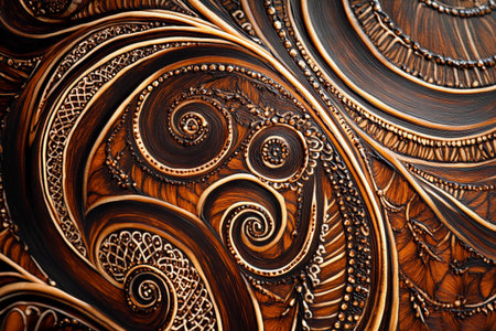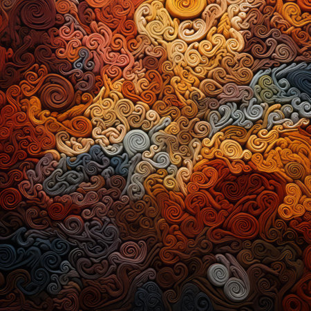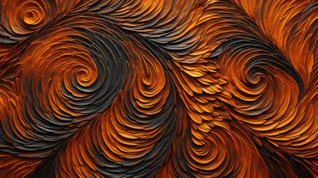 abstract swirly patterns on a dark background create a visually captivating image reminiscent of colorful woodcarvings. the richly colored skies and heavy impasto technique add depth and texture to the artwork. inspired by voxel art, this piece showcases the artistic styles of matthias haker and james ensor, with a touch of terracotta tones. ai generated