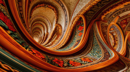 Experience the mesmerizing beauty of intricate swirling patterns, filled with vibrant colors and elegant designs, creating a captivating architectural space.