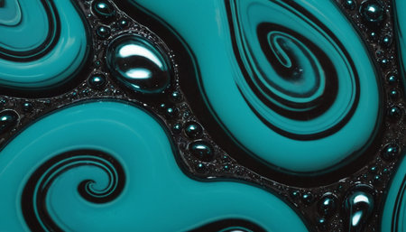 A highly detailed macro showcases swirling teal liquid with intricate dark lines and organic patterns. Small, metallic-looking bubbles and droplets are clustered together, catching the light and creating a shimmering effect. The fluid's movement is evident in the smooth, flowing curves and spiral formations. This abstract composition offers a sense of depth and complexity, with a rich interplay of color and texture.