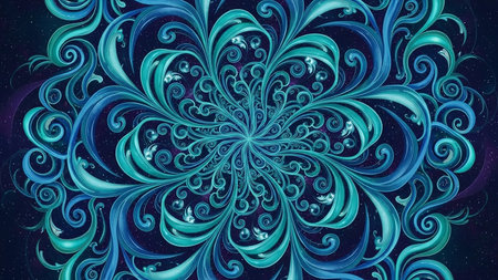 An intricate blue and teal floral mandala with detailed swirling patterns, set against a dark, starry background.