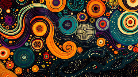 An artistic composition features an array of swirling shapes and forms in various colors. The image presents a close-up perspective showcasing textured patterns. The colorful arrangement suggests a decorative element suitable for backgrounds, design projects, or creative applications. The design is presented in a way that suggests both a modern and vintage aesthetic.