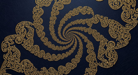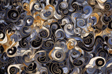 Spirals showing intricate golden spiral patterns with black filigree details on a textured dark grey background creating an ornate and abstract keywords: abstract, golden, spirals, ornate,...