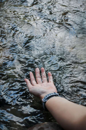 Hands touch in flowing water from the river in nature outdoors on a sunny warm day,