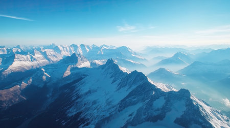 Stunning aerial view of the Swiss Alps peaks. High resolution, clear sky, ample copy space, no people