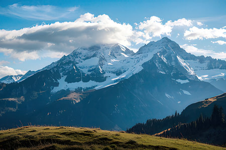 Summer mountain landscape with green grass and mountain peaks. Swiss Alps