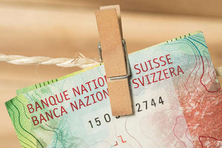 A 50 Swiss franc bill on a clothesline with a clothespin