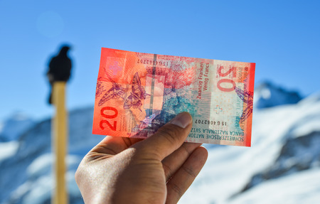 Hand holding a 20 Swiss franc banknote with snow mountain background.