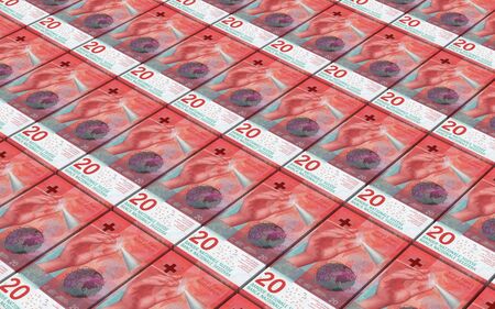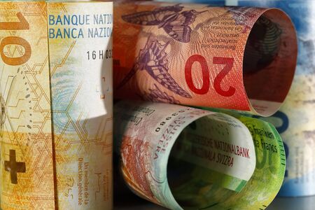 Money of Switzerland. Swiss franc bills. CHF banknotes. 20 francs. Business, finance, news background.
