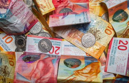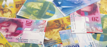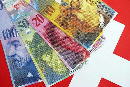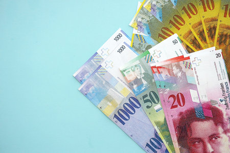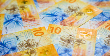 The Swiss currency banknotes arranged in this way form the financial backdrop
