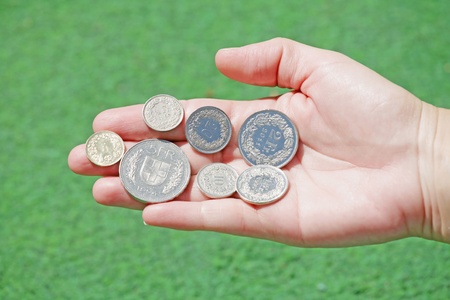 Total set of swiss franc coins hold in open hand