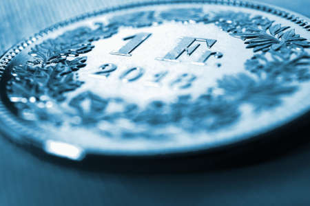 1 Swiss franc coin close-up. Dark blue tinted illustration on an economic, business, entrepreneurial or financial theme. Money, Central Bank, banking in Switzerland. Macro